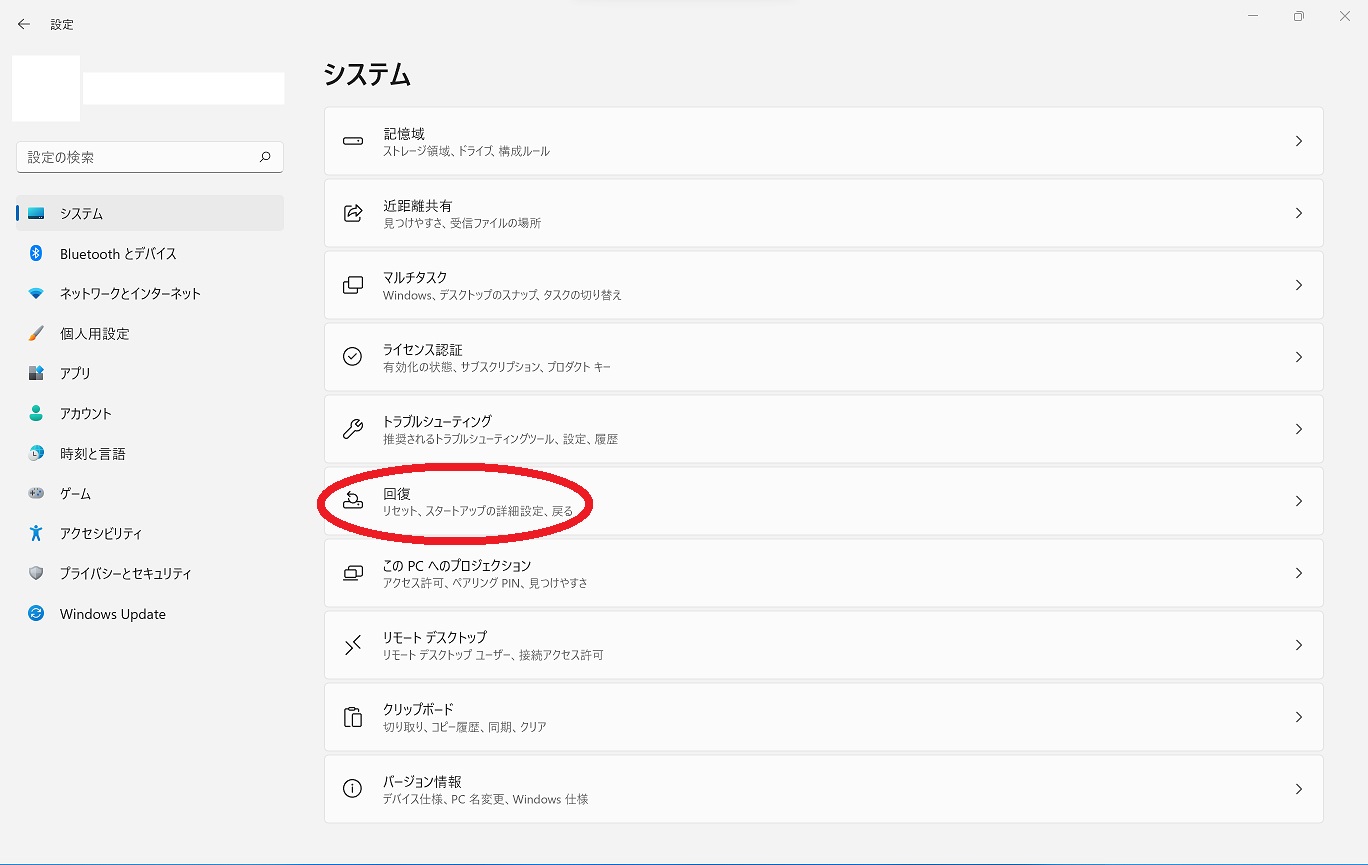 スタートメニューを右クリック→設定→回復→復元の順にクリック or タップ