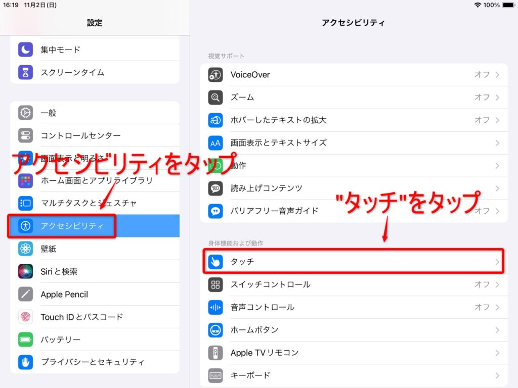 設定アプリを開きアクセシビリティ→タッチの順にタップ