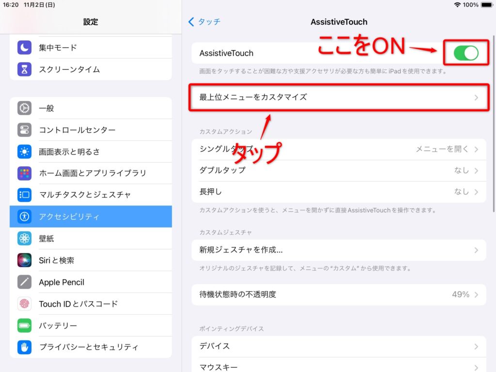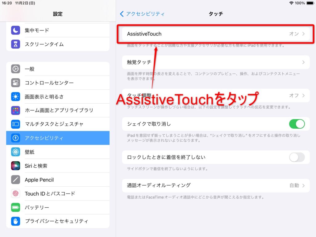 そこで活躍するのがiPad本体のアクセシビリティ機能「AssistiveTouch」