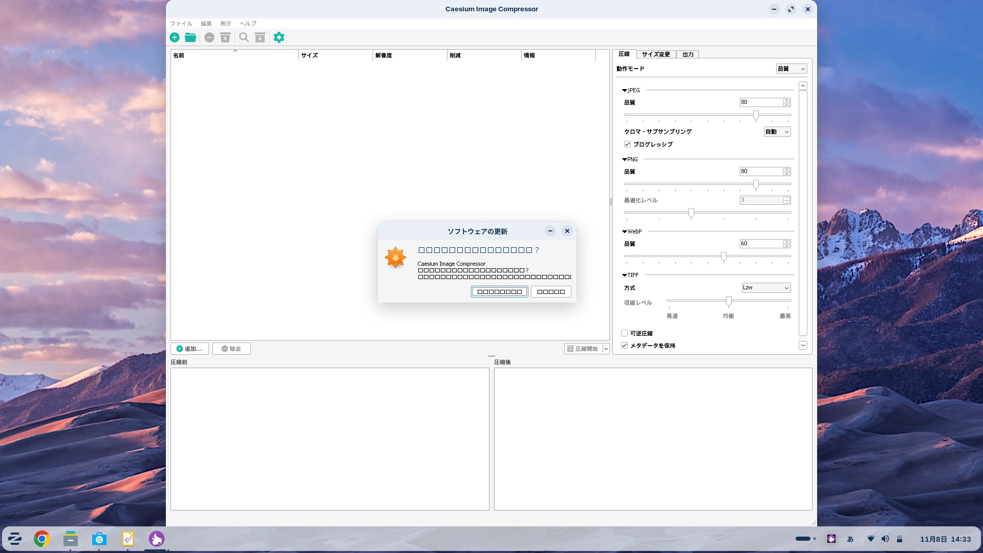 画像リサイズについては Windows用ソフト「Caesium」がZorin OSの互換機能でうまいこと動作し、縮小は可能でした。