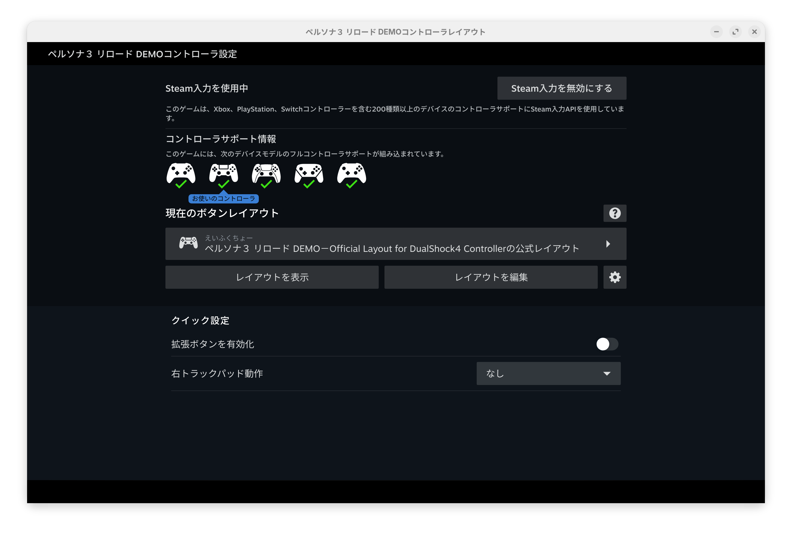Steamのコントローラー設定で「Steam入力を有効にする」と、なぜかゲーム上で外部コントローラーの操作を受け付けなくなる、という不可解な現象が発生しました。